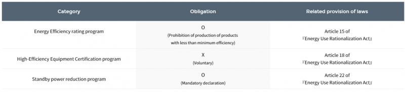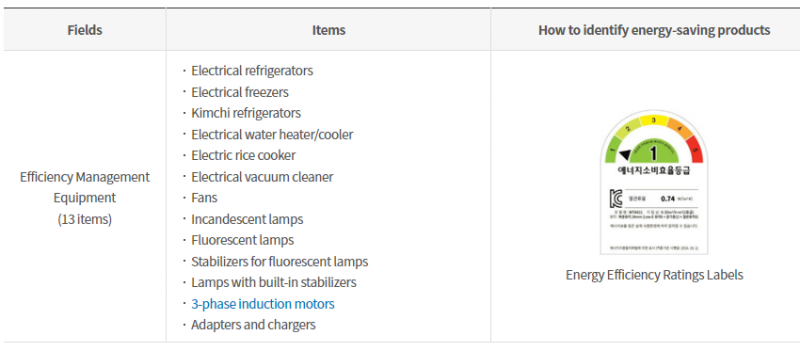 In Korea, there are 3 main types of Energy Efficiency certification: - Energy Efficiency rating program - High-Efficiency Equipment Certification program - Standby power reduction program