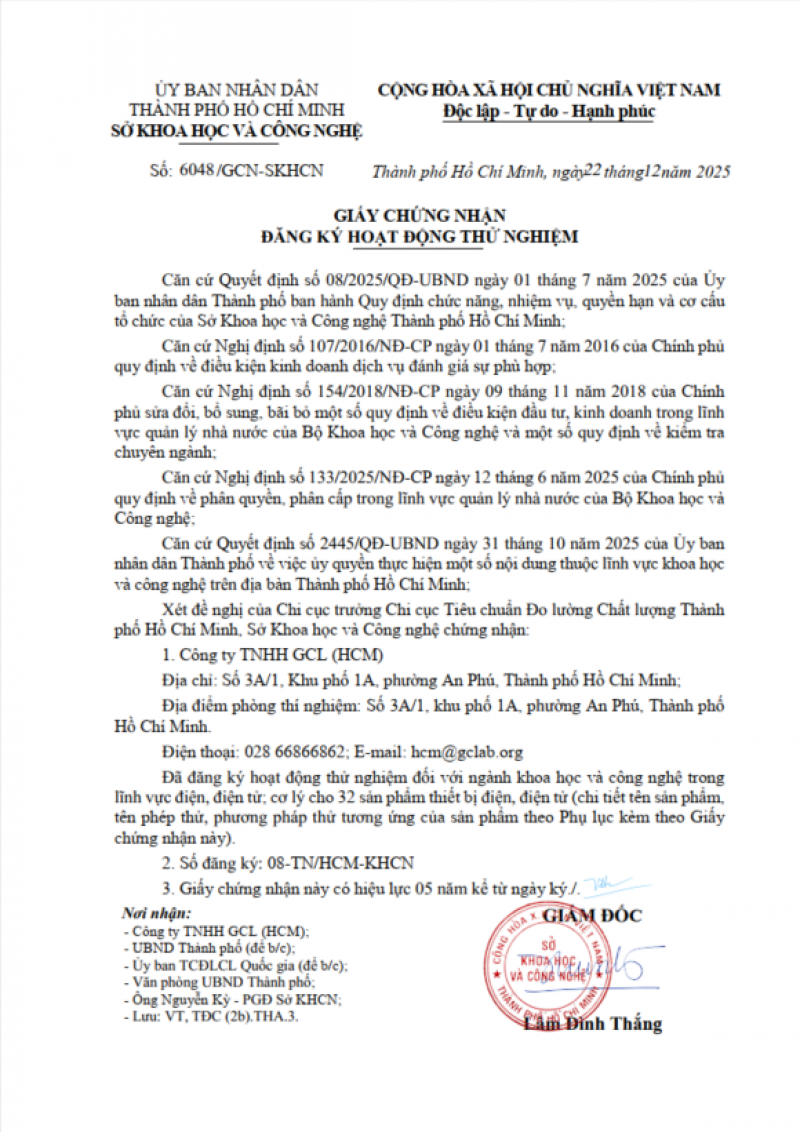 On December 24, 2025, Our GCL HCM is very proud and happy to recieve a testing service certification (Directorate for Standard, Metrology and Quality) according to Decree 107/2016/ND-CP. From now on, Our GCL HCM lab can officially provide testing service in Viet Nam. This is a big turning point, marking the development of laboratory as well as open bussiness opportunity in both domestic and oversea.
